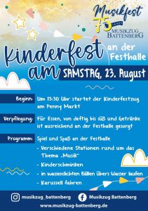 - ca. 14:00 Uhr: Kinderfest an der Festhalle mit Spiel & Spaß für die Kleinen