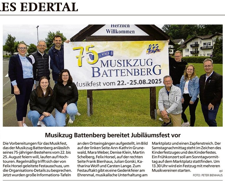Klingende Marschmusik in gewohnter Weise und Filmmusik spielte der Musikzug in seiner bekannten Marine-Uniform. Musikzug-Vorsitzender Frank Bienhaus begrüßte die zahlreichen Gäste und hielt einen Rückblick auf die 75-jährige Vereinsgeschichte. Er bezeichnete den Musikzug als musikalischen Botschafter der Stadt Battenberg. Im Foyer waren Fotowände mit historischen Bildern aufgestellt.